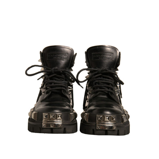 Dolce & Gabbana Black Leather Studded Trekking Boots Shoes