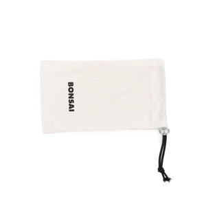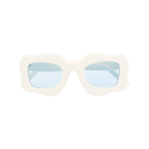 oversized curved-frame sunglasses from Bonsai featuring white, oversize frame, curved corners, blue tinted lenses, logo print at the arm and straight arms. These glasses come with a protective case.. Happy sunglasses Size and Fit - Arm Length: 14.5 Centimetres. Bridge Width: 2.7 Centimetres. Lens Diameter: 4.8 Centimetres. Total Width: 13.5 Centimetres.