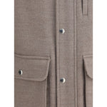 Brunello Cucinelli’s wool Jacket is a sophisticated and functional piece with a high collar fitted with a flap and button to close it, adding an elegant touch. The double-slider front zipper closure, enhanced with a flap and buttons, gives it a distinctive and practical design. The two flap patch pockets on the front provide ample space, while the vertical zippered breast pocket adds an element of functionality. Adjustable button cuffs complete the look, ensuring a custom fit and a touch of refined style.