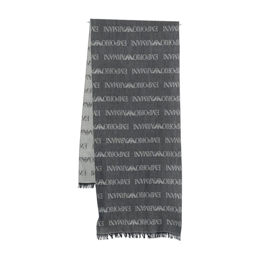 • Emporio Armani Wool blend scarf with navy blue logo pattern, fringed edges, rectangular shape, 185cm length, and 44cm width.