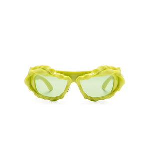 fluorescent green acetate high-shine finish 3D twist detailing logo print at the arm rectangle shape green tinted lenses UV-protective lenses sculpted arms curved tips These glasses come with a protective case. Twisted sunglasses