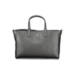 Step into the world of eco-chic luxury with the Tommy Hilfiger handbag that’s as functional as it is stylish. Crafted with recycled polyester, this sleek black tote boasts two handles and a removable shoulder strap for versatile carrying options. Two spacious compartments, a central pocket, and additional internal pockets keep your essentials organized. Contrasting details and the iconic Hilfiger logo lend an air of distinguished flair, while protective feet assure your investment is well-guarded. Make a statement with this environmentally-conscious accessory.